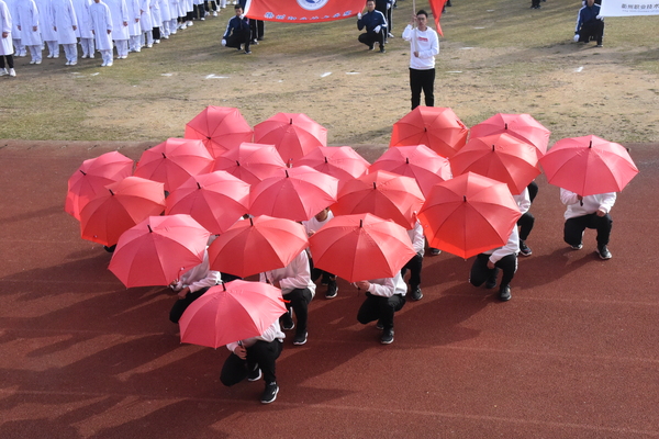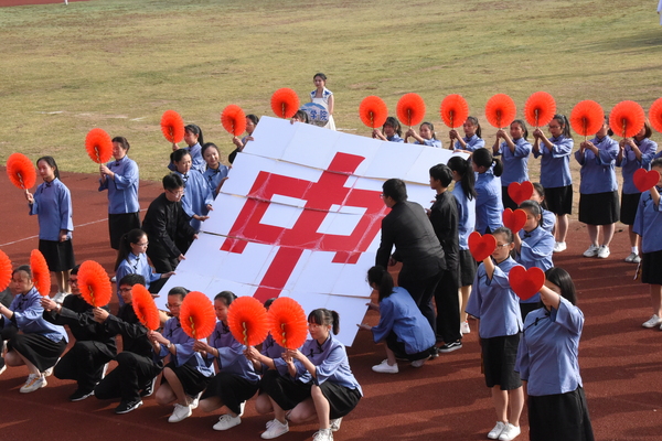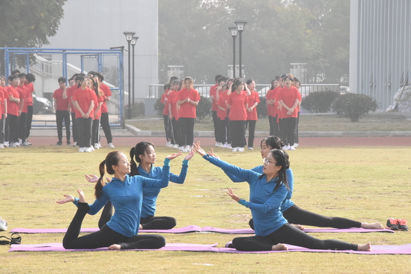 激烈而又密集的鼓声带动着众人的热情,一面面热情似火的红旗在茵绿的草坪上舞动着、燃烧着,昭示着青春的热情。随后,是女教工的瑜伽表演,舞动的身躯展示了女性的柔和,温情似水。紧接着,是各二级学院共同组成的学生广播操表演,整齐一致。三个团体表演为运动会拉开了序幕。