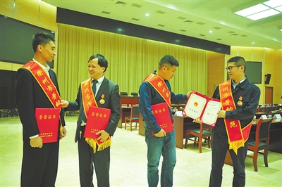 兄弟俩、师徒俩劳模接受表彰后,相互鼓励,表示要再接再厉,再创佳绩!从左至右,分别是:毕少平、余富忠、许国凯、许国华。