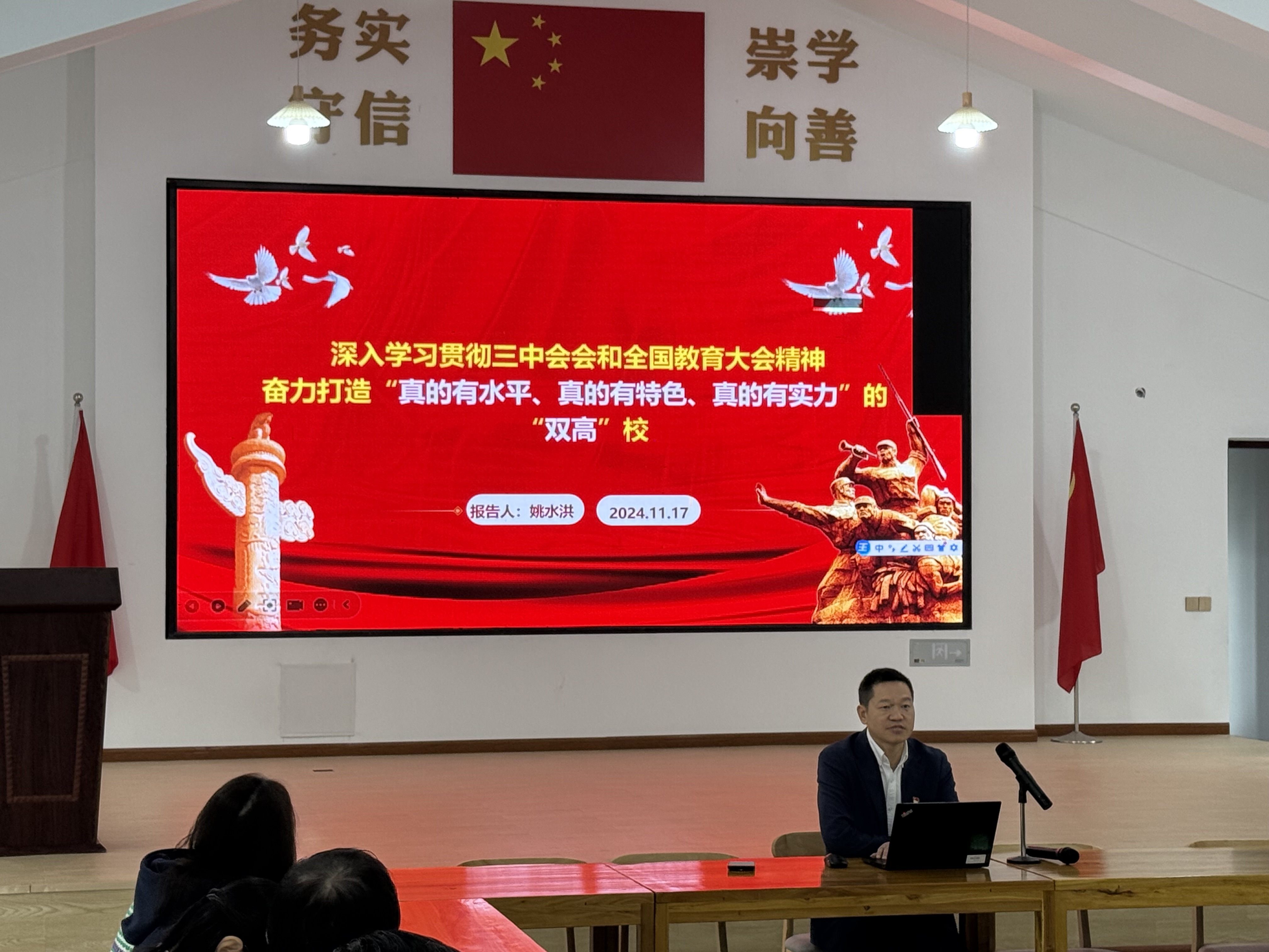 党委委员、副校长姚水洪作题为《深入学习贯彻三中全会和全国教育大会精神奋力打造“真的有水平、真的有特色、真的有实力”的“双高”校》的专题党课。姚水洪结合学校的各项事业发展实际,围绕“学习领会三中全会精神 学深悟透《决定》核心要义”“落实全国教育大会精神 加快教育强国建设新的征程”“奋力推进‘新双高’建设 培养更多新质高技能人才”等3个模块,进行了详细的论述,并要求党员同志们领会精神、把握要义,积极推动现代职业教育体系改革、“新双高”建设、“五金”建设、有组织的科研活动开展、公共教学部党员教师专业特长发挥等工作出标志性成果、见实实在在成效。