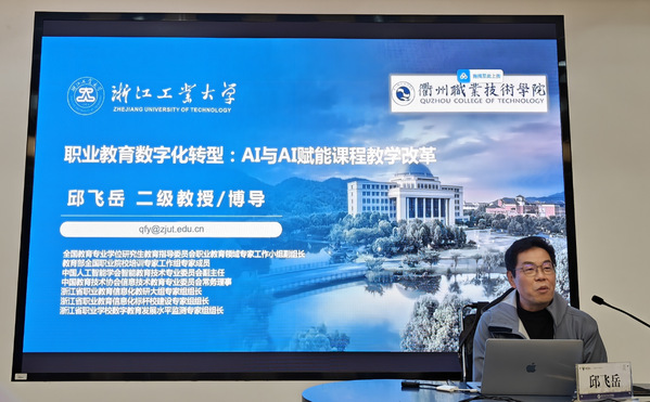 为深入贯彻落实党的二十届三中全会精神,围绕学校“新双高”建设工作,聚焦构建数字化教学新生态,推动学校高质量发展,11月25日下午,浙江工业大学职业技术教育学院原院长、二级教授、全国教育专业学位研究生教育指导委员会职业教育领域专家工作小组副组长邱飞岳教授应邀来校作《职业教育数字化转型:AI与AI赋能教学改革》专题讲座。党委委员、副校长余建军主持,全体中层干部及基层教学组织负责人100余人参加。