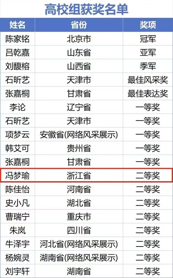 11月30日,由教育部主办,北京外国语大学全国青少年法治教育中心承办的第九届全国学生“学宪法 讲宪法”活动全国总决赛演讲比赛圆满落幕。为期三天的演讲比赛分为主题演讲和命题演讲两轮比赛,来自全国31个省(自治区、直辖市)、新疆生产建设兵团及香港、澳门特别行政区的160名选手齐聚一堂,讲述他们“学宪法”的精彩故事。由我校法规处、团委指导的冯梦瑜同学作为浙江高校唯一代表参加国赛。