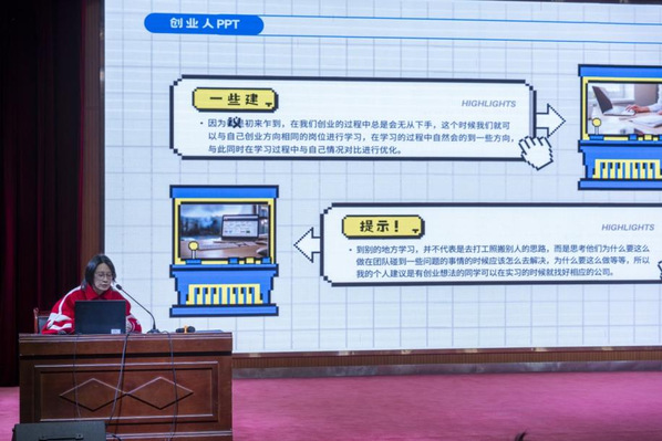 艺术设计学院党总支副书记范洪梅发表讲话,“四位优秀校友虽然步入职场不久,但都取得了不错的成绩,或在设计公司崭露头角,或在自主创业中取得了长足进步。他们用亲身经历,详细讲述了工作中的点滴体会以及创业路上的艰辛与成就,鼓励学弟学妹们定好目标,持之以恒。”